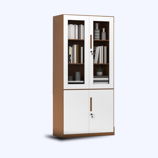 Armoire de bureau en bois avec portes vitrées et compartiment inférieur verrouillable, idéale pour le rangement et l’exposition de dossiers et objets professionnels au Cameroun.
