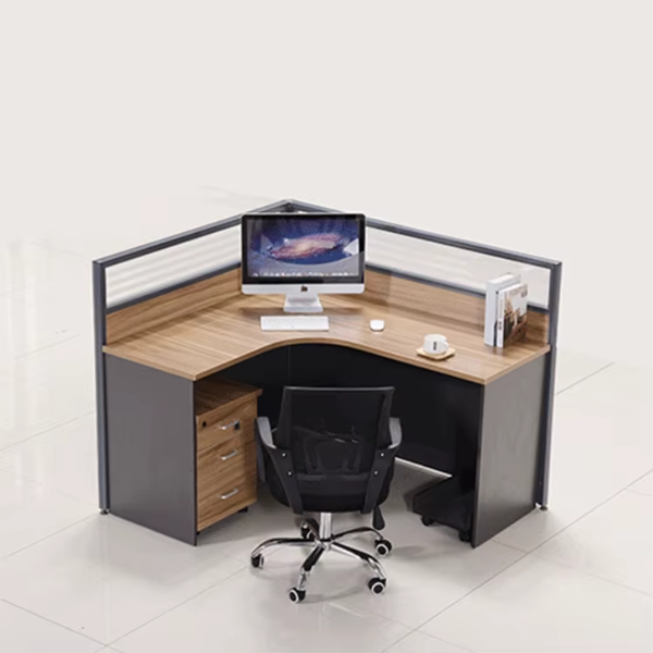 Poste open space d’angle avec cloison séparative, conçu pour offrir un espace de travail confortable, organisé et moderne dans les environnements professionnels.