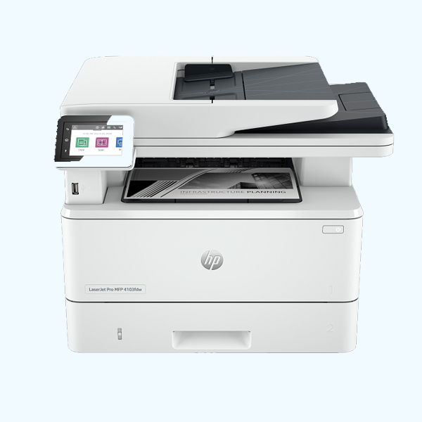 Imprimante HP LaserJet Pro MFP 4103fdw multifonction 4-en-1 : impression, copie, scan et fax, avec Wi-Fi, réseau et recto verso automatique.