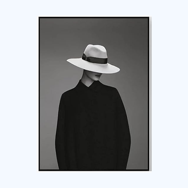 Transformez l’ambiance de votre pièce avec ce tableau noir et blanc captivant. L’art du contraste est ici utilisé pour créer une œuvre à la fois sobre et puissante. Le blanc éclatant du chapeau se détache magnifiquement sur le fond gris et la tenue sombre, attirant immédiatement le regard et créant un point focal élégant dans votre décoration d’intérieur.